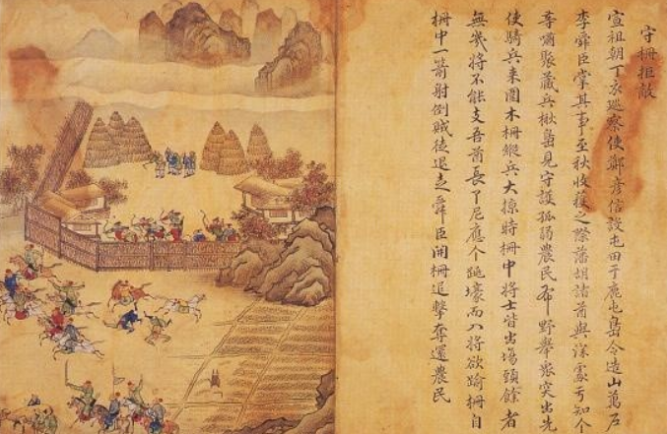 이미지 설명: 녹둔도 전투 당시 조선군과 여진족의 전투를 묘사한 그림.